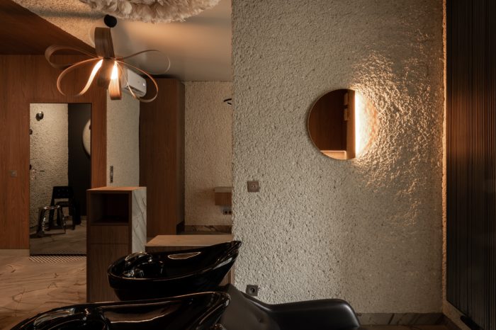 a biała przestrzeń staje się sceną dla fryzjera.