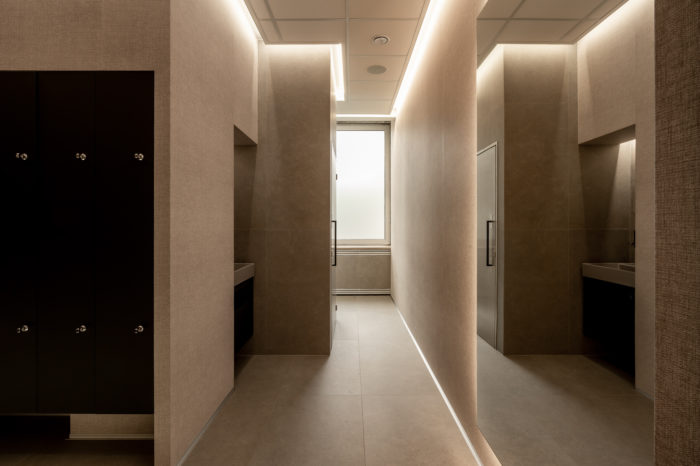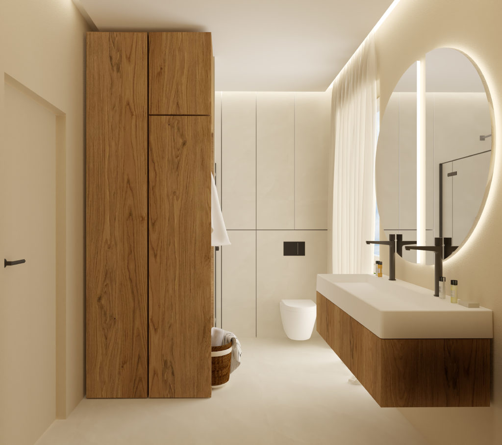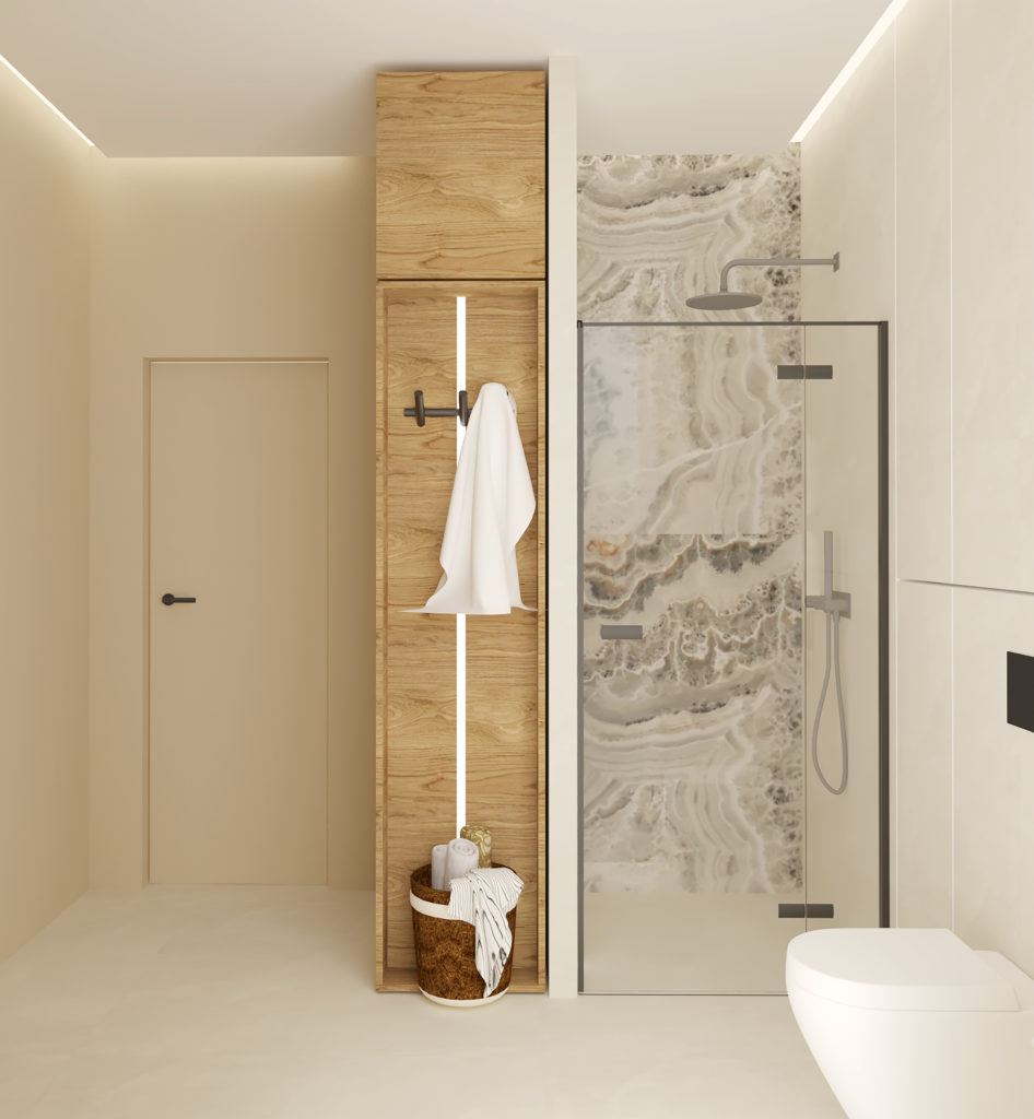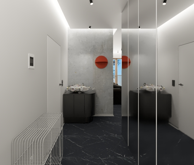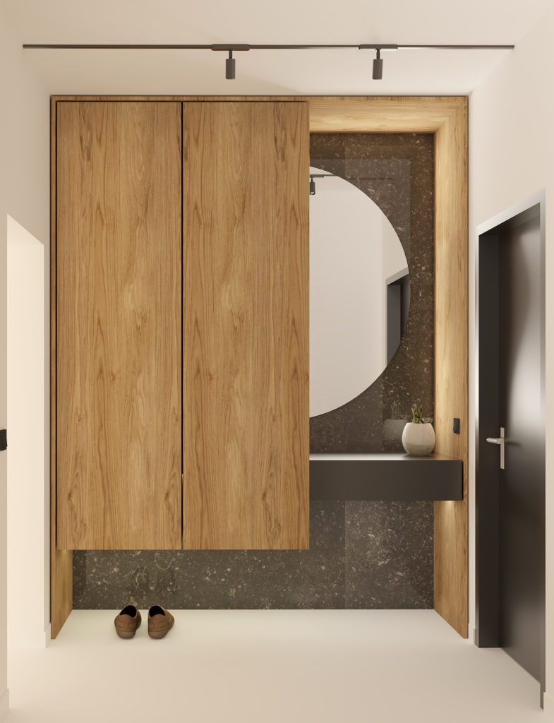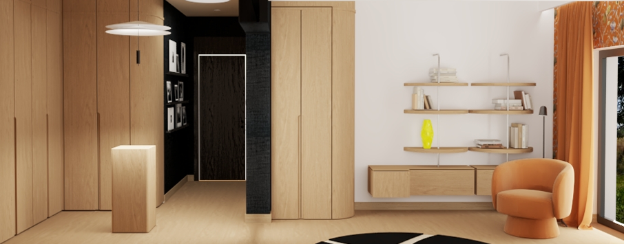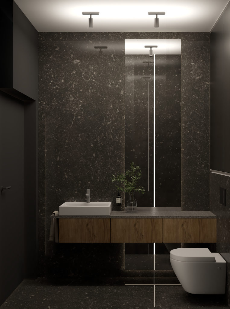 To co wyróżnia to wnętrze od samego początku, to swoista gra bieli i czerni, która tworzy oazę spokoju i relaksu. Wejście w kolorze jagodowej czerni jest cieniem, z którego wyłania się światło,